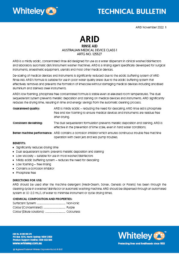 ARID Rinse Aid is a mildly acidic, concentrated rinse agent designed for use in clinical washer/disinfectors and laboratory instrument washers. Specially formulated for surgical instruments, anaesthetic equipment, and medical devices, ARID reduces drying time, prevents limescale buildup, and protects against staining—even in areas with poor water quality.