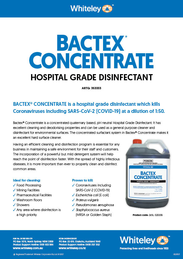 Bactex® Concentrate is a hospital-grade, pH-neutral disinfectant proven to kills coronaviruses (SARS/COVID-19), E. coli, MRSA, and other harmful bacteria. Its quaternary-based formula includes a powerful yet mild detergent system that cleans and disinfects hard surfaces efficiently, helping achieve faster and more effective hygiene results. Ideal for use in food processing plants, pharmaceutical facilities, mining operations, washrooms, and other high-risk areas, Bactex® Concentrate combines cleaning, deodorising, and disinfecting in one powerful solution. It’s the ideal choice for businesses aiming to maintain a safe and hygienic environment for staff and customers.