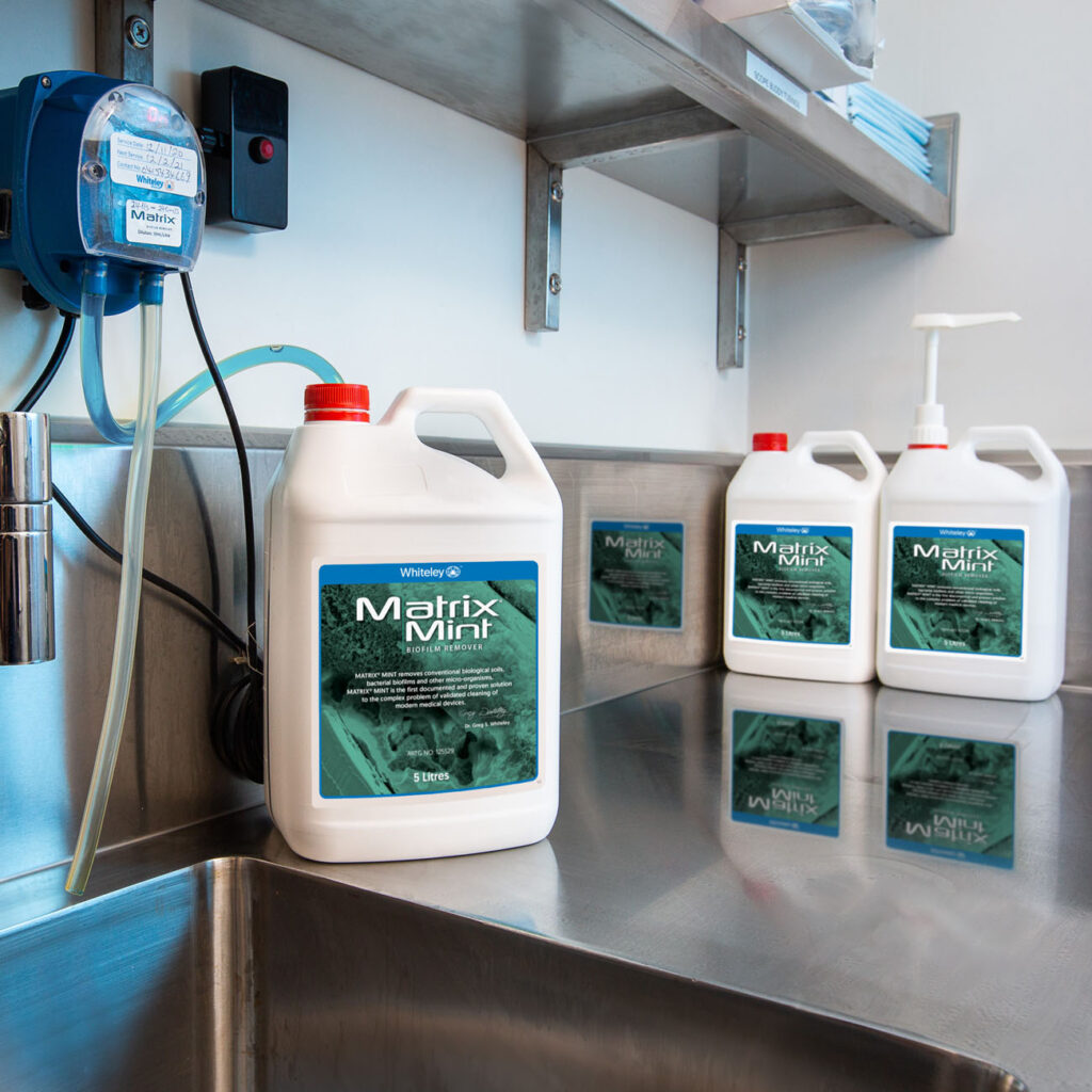 Matrix® Mint is a non-enzymatic detergent and biofilm remover designed for use in Endoscopy, Central Sterilising Departments, and Dental Practices. Backed by peer-reviewed data, it effectively removes bacterial biofilms and biological soils—offering a validated solution where enzymatic cleaners fall short.