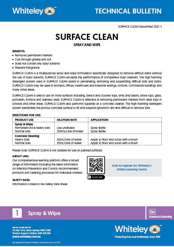 Safe for use on a wide range of surfaces—including benchtops, sinks, stovetops, glass, porcelain, Formica, stainless steel, and concrete—Surface Clean is ideal for kitchens, offices, healthcare facilities, schools, and industrial settings. It also excels at removing permanent marker stains from desks and smooths vinyl surfaces, all while leaving a pleasant pine fragrance.