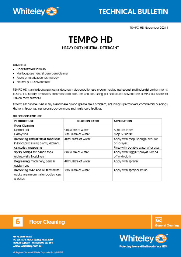 Approved by the New Zealand Ministry for Primary Industries as a maintenance compound under the Animal Products Act regime, Tempo HD meets stringent hygiene standards for use in food-related environments. Available in 5L and 15L containers, it is suitable for use in kitchens, commercial buildings, factories, healthcare facilities, and more. For more information or to request a copy of the MPI approval, please contact Whiteley at whiteley@whiteley.co.nz.