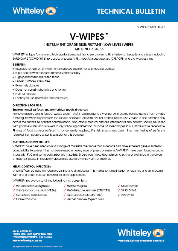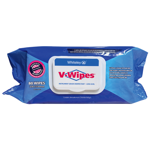 V-Wipes™ offer a powerful, hospital-grade disinfectant solution, proven to eliminate a broad spectrum of bacteria and viruses—including SARS-CoV-2 (COVID-19) in just 60 seconds, VRE (Enterococcus faecalis), CPE/CRE (Klebsiella pneumoniae), and the Measles virus. These low-level, instrument-grade wipes are ideal for cleaning and disinfecting environmental surfaces and non-critical medical equipment like hospital beds and theatre trolleys. The pH-neutral formula is safe for use on most surfaces and features a high-quality, apertured fabric for fast, effective cleaning without streaking. Highly absorbent and durable, V-Wipes™ are non-hazardous, non-flammable, and free from phenolics, chlorine, and PHMB.