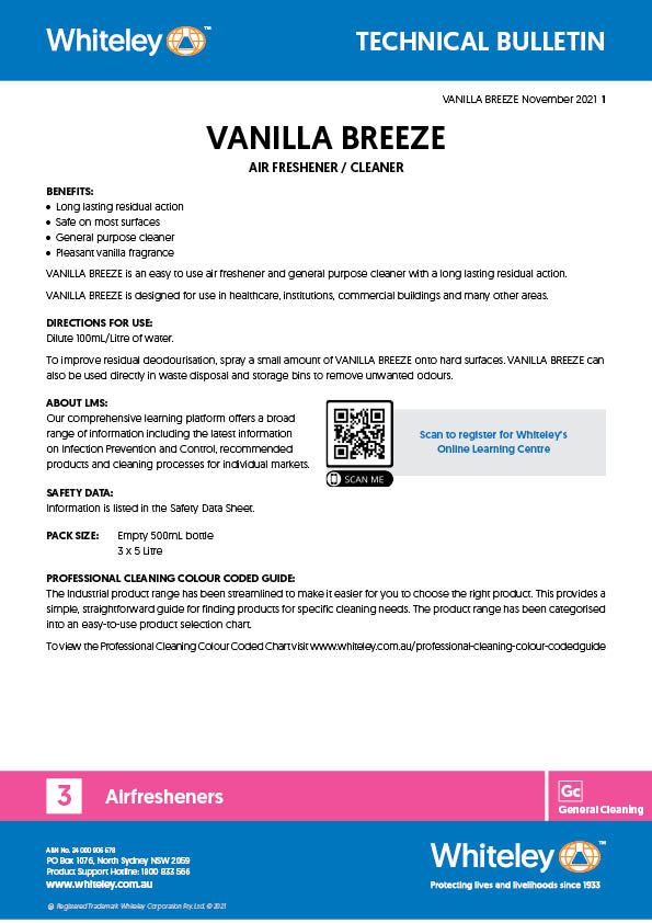 Vanilla Breeze is a long-lasting, water-based air freshener, general-purpose cleaner, and sanitiser designed to eliminate unwanted odours while leaving a pleasant vanilla fragrance. Its effective residual action ensures ongoing freshness, making it ideal for healthcare, institutions, commercial buildings, and more.